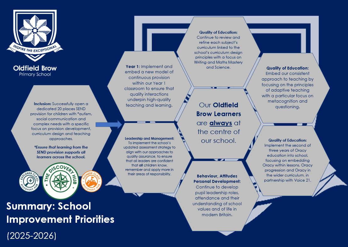 At Oldfield Brow, we place continued school improvement at the centre of the school's drive to secure academic excellence for all children within the happiest and most supportive of school environments. We see this as essential to ensuring that we can meet our values and aims of "Inspiring the Exceptional" potential of each of our learners who have the knowledge and attitude to "thrive in a changing world" (School Vision, 2023)